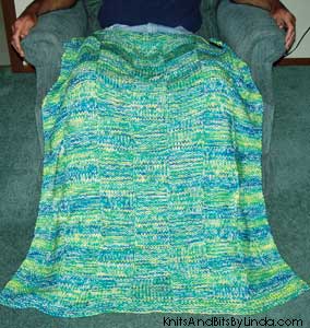 Banana Berry acrylic yarn is a multi color yarn of shades of blue and green. It was combined with a White acrylic yarn to form this combination blanket. The basket weave or checkerboard pattern adds texture to the blanket, also making it a reversable lap afghan. The close-up shot below shows the corner edge where you can see the pattern. It is machine washable and dryable. This soft, cozy throw will last for many years. It is 36" X 43" in size, a little larger than the others.