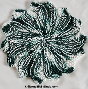 All petal dish cloths are made in a swirling design. Basil Ombre is a 100% cotton yarn mix of dark greens and white. Each hand knit petal cloth measures approximately 11" across. Return to Petal Swirl Cotton Dish Cloths page