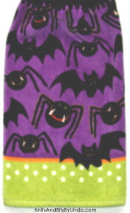 There are black bats and black spiders scattered across a purple background on this kitchen hand towel. There is a green border with white dots across the bottom edge. Black acrylic yarn was used to make the crocheted hanging top. Return to Halloween Hand Towel page