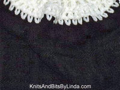 This style was made with a textured kitchen dish towel. The hand crocheted top is done with a plain white yarn. Although hard to see in this picture, there is a window pane pattern to the towel. Return to Solid Black Hand Towel page
