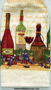New Vineyard is the name of this hanging kitchen hand towel featuring 5 wine bottles in different colors and shapes. On the table are clusters of red and purple grapes along with a couple of corks. In the background are rows of the names of all types of wine. It is a 100% cotton terry towel with a hand crocheted Ivory color acrylic yarn top. Return to Printed Towels page 4