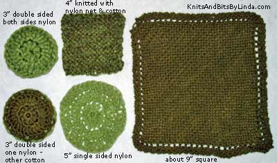 Evergreen cotton yarn was used to make this scrubbie set. Olive Green nylon netting was used for the 3" and 5" round scrubbies, the 3" being double sided and the 5" is single thickness. The other 3" scrubbie is made with olive nylon net on one side and 100% cotton evergreen yarn on the other. The 4" square is knitted with the evergreen cotton yarn and olive netting together through out. It makes a nice scrubber cloth to get inside of glasses or mugs. The 9" hand knitted dish cloth is 100% cotton yarn in the evergreen color. The plastic flower pot the set comes in makes a handy place by the sink to store the scrubbies when not in use. Pot color and contents may vary slightly due to availability.